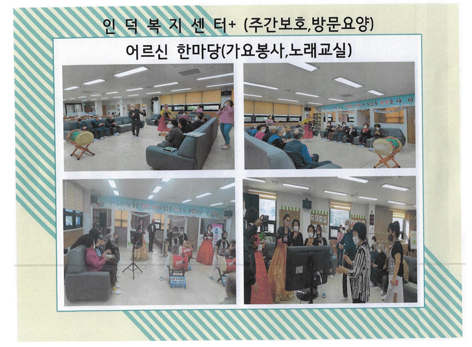 안전한 시설과 쾌적하고 넓은 공간에서 어르신의 행복한 시간을 만들기 위해서 다양하고 특화된 프로그램 운영으로 인덕복지센터+ 에서 정성을 다해 모시고 있습니다. 어르신의 편안함과 즐거운 노후, 그리고 가족 모두의 행복한 삶의 위하여 정성을 다하겠습니다.