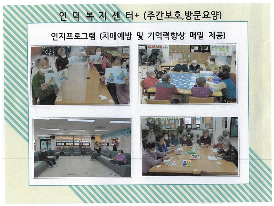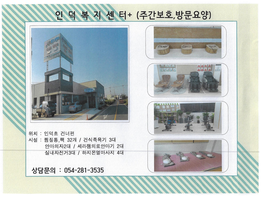| 기관명 | 인덕복지(주간보호, 방문요양)센터+ | 급여종류 | 주간보호센터 |